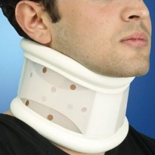 Collare cervicale rigido regolabile con chiusure a velcro.
